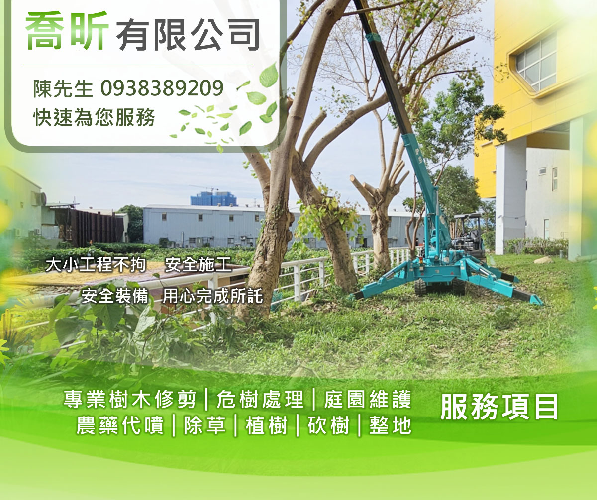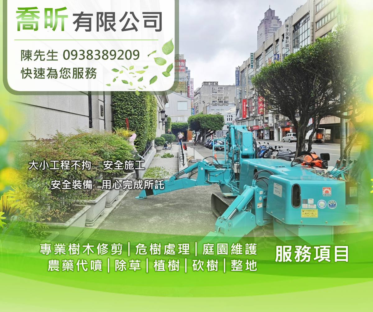 喬昕有限公司從事園藝已有多年經驗,主要服務於台北市、新北市、桃園市…等各區。服務項目包含除草、割草、整地、砍樹、鋸樹、伐木、庭園維護、花木修剪、樹木修剪、樹木砍除、樹木挖除、樹木種植、樹木運送、危樹處理、清潔、清運…等工程,不論是社區、學校、工地、別墅、公司、工廠、住家皆能為您服務。